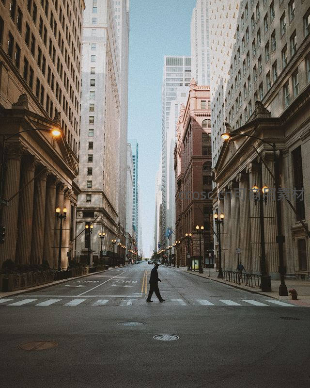 高耸的现代楼宇与庄严的古典柱廊形成鲜明对比,一位行人独自行走于宽阔街道中央,营造出都市中的孤寂感与空间纵深感。