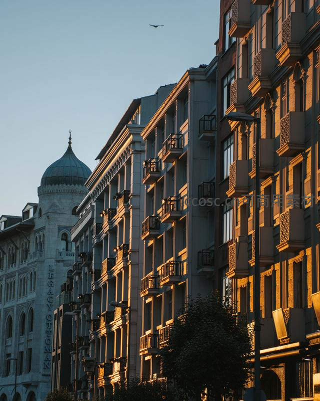 温暖的夕阳光线斜照在具有古典装饰的建筑立面上,阳台和窗框投下柔和阴影,远处清真寺圆顶静静矗立,营造出宁静而怀旧的城市午后氛围。