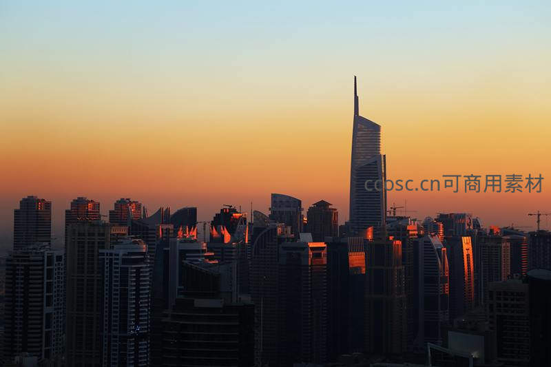 当太阳沉入地平线,迪拜的摩天大楼群化为深色剪影,沐浴在温暖的橙红色晚霞之中。建筑轮廓清晰锐利,天空色彩渐变绚丽,勾勒出一幅壮丽的城市黄昏画卷。