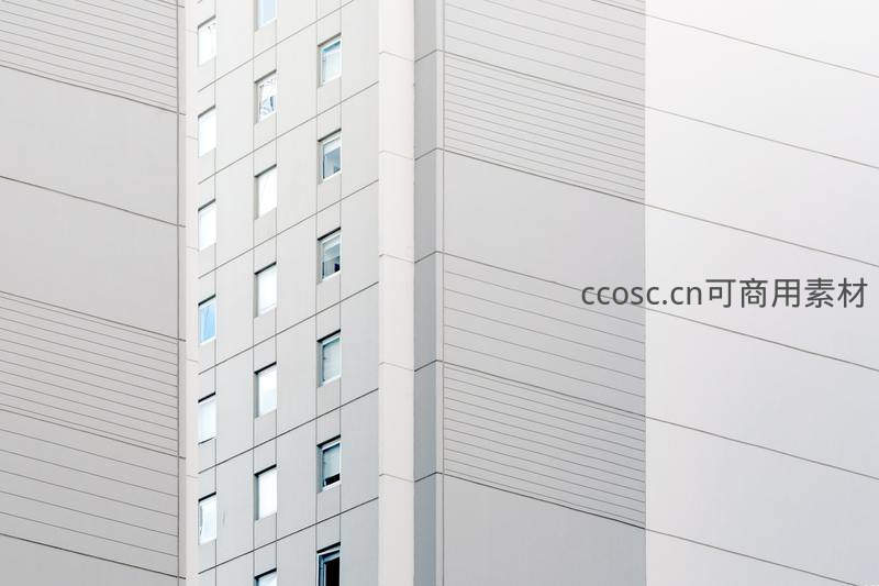 这张图片聚焦于一栋现代建筑的外墙,通过特写镜头捕捉其简洁的几何线条、整齐排列的窗户和不同质感的灰白色面板,呈现出强烈的秩序感。