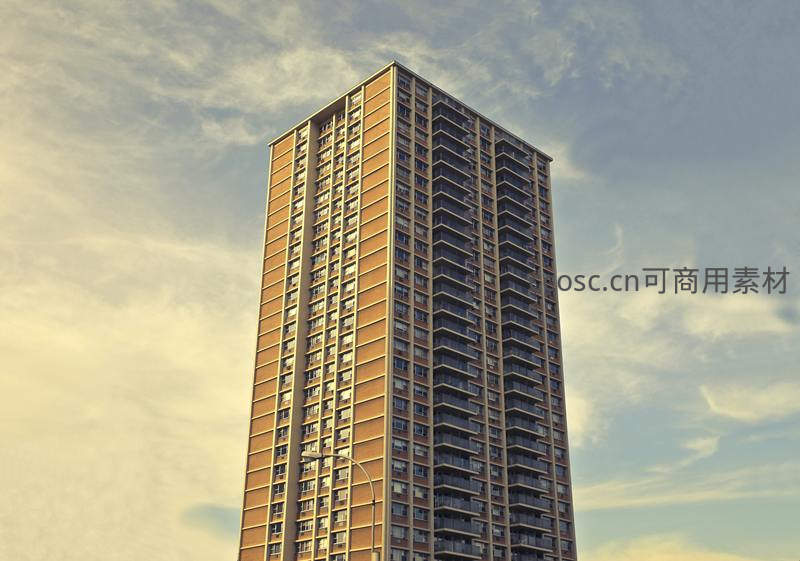 仰望高层住宅楼,暖阳斜照云影斑驳