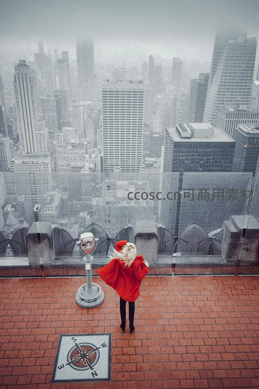 红衣女子俯瞰云雾缭绕的都市