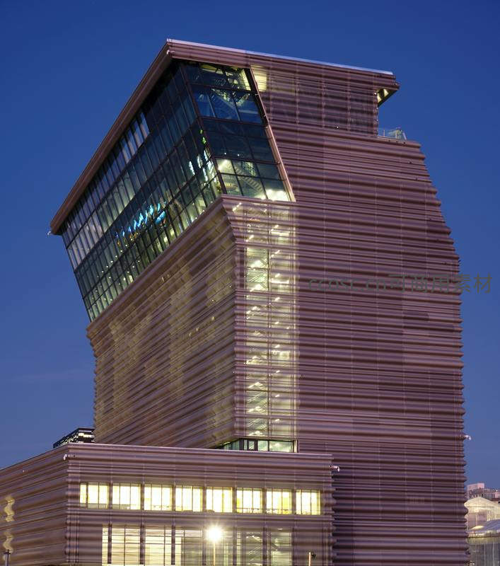 黄昏时分现代建筑立面光影交错