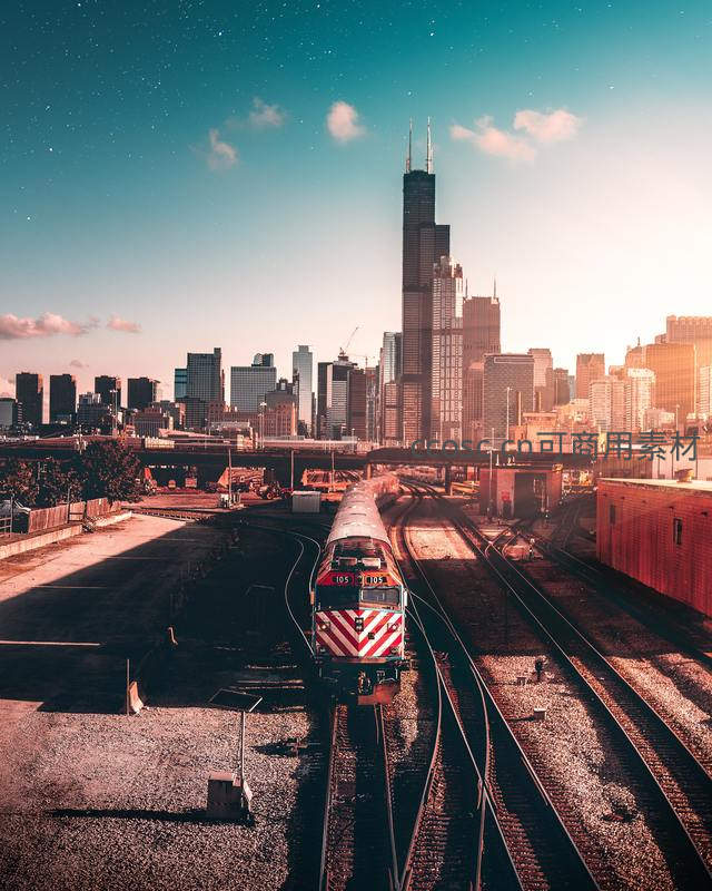 一列红色的火车沿着铁轨驶向远方,背景是沐浴在金色夕阳中的摩天大楼群,展现了现代都市中工业运输与宏伟建筑交相辉映的独特景象。