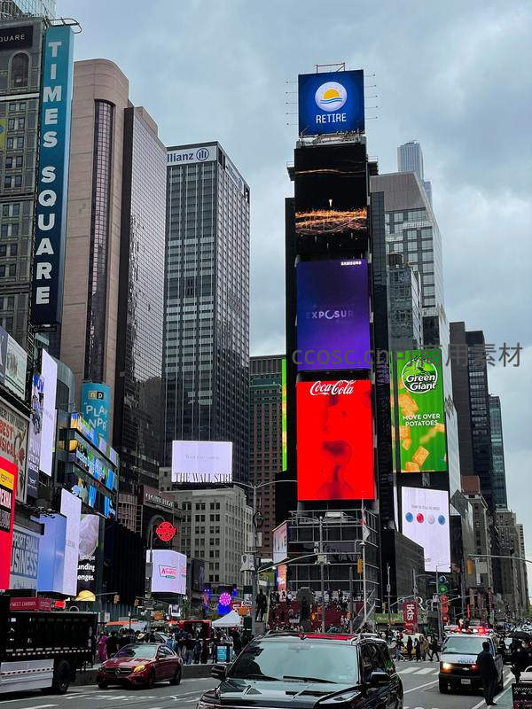 纽约时代广场中心,巨型LED屏幕播放着各色广告,下方车流不息,游客熙攘,尽显全球最繁华商业区的喧嚣与活力。