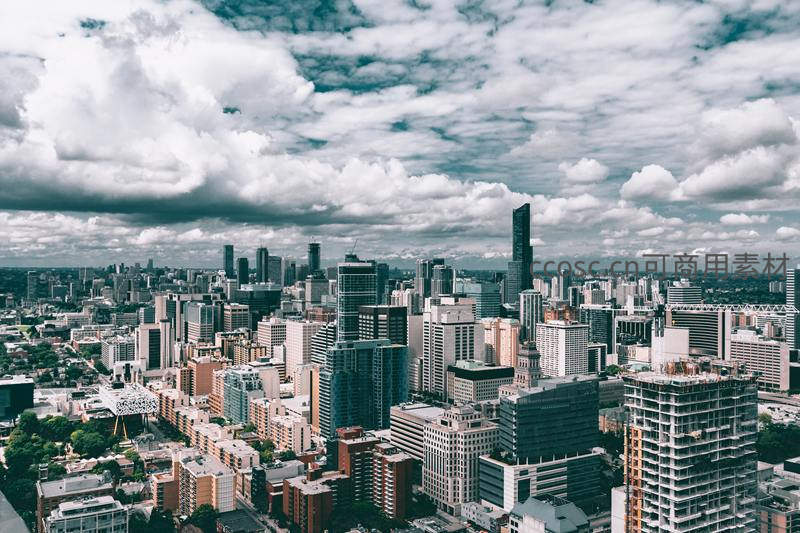 从高空俯瞰,大片云层覆盖着城市上空,众多摩天大楼刺破云层,城市建筑群在光影交错中展现出层次丰富的立体感,营造出恢弘而略带神秘的氛围。