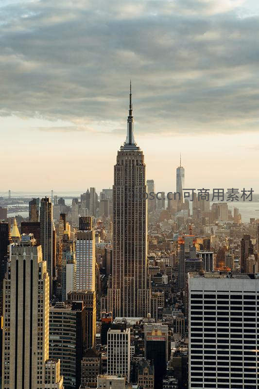 晨光初照,帝国大厦巍然屹立于密集的城市建筑群中,尖塔直指多云天空,远处自由女神像隐约可见,整座城市在柔和光线中苏醒,展现活力与秩序之美。