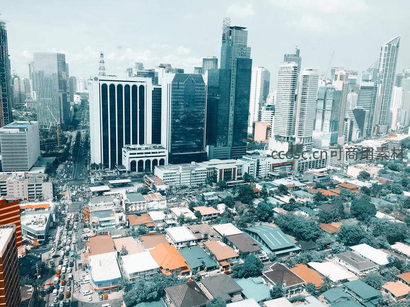 从高空俯瞰曼谷,现代化的摩天大楼与低矮的传统民居形成鲜明对比,车水马龙的街道穿梭其间,展现了这座城市的活力与层次感。