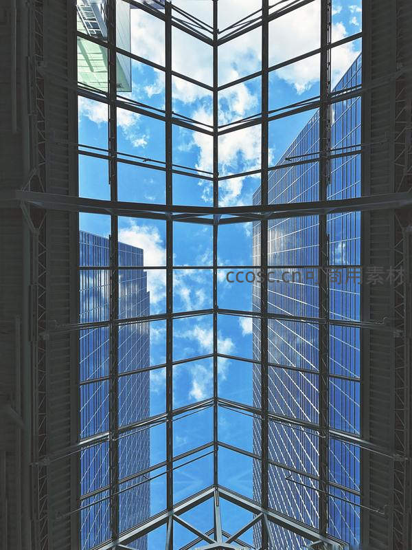 透过巨大的玻璃穹顶向上望去,湛蓝的天空与朵朵白云清晰可见,两侧摩天大楼的倒影在玻璃上交相辉映,营造出通透而富有科技感的空间氛围。