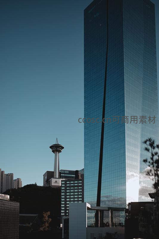 高耸入云的玻璃幕墙摩天大楼在晴朗蓝天下矗立,远处标志性塔楼清晰可见,展现了现代都市的宏伟与秩序。