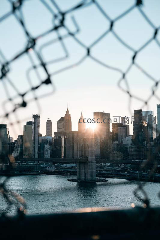 透过铁丝网看日落时分的城市剪影