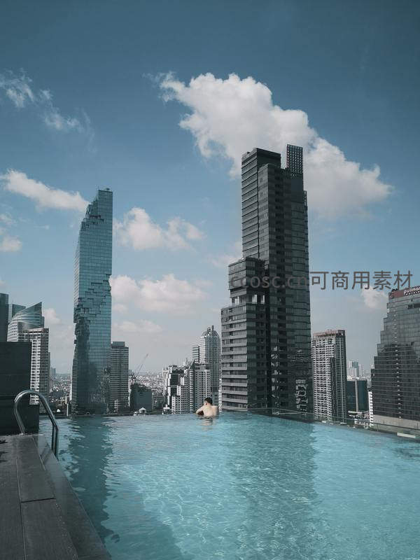 从屋顶无边泳池中仰望,湛蓝水面与远处林立的摩天大楼融为一体,一人悠然畅游,尽享都市奢华度假体验。