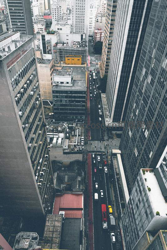 从高处向下凝视,狭窄的街道被两侧高耸入云的摩天大楼紧紧夹住,车流如织,展现了现代都市空间的紧凑与繁忙的生活节奏。
