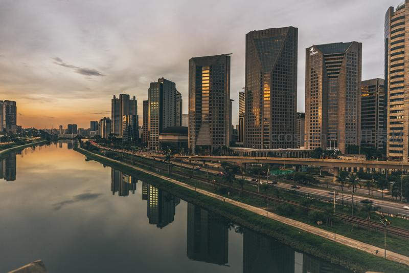 夕阳西下,金色的光辉洒满河面,两岸的现代化摩天大楼在平静的水面上投下清晰倒影,构成一幅宁静而壮丽的城市黄昏画卷。