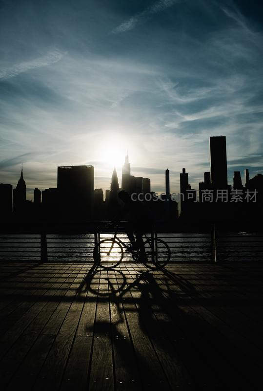 夕阳余晖中,骑行者的剪影与身后壮丽的城市轮廓融为一体,木质栈道延伸至水边,光影交错间定格了都市生活中宁静而充满活力的一刻。