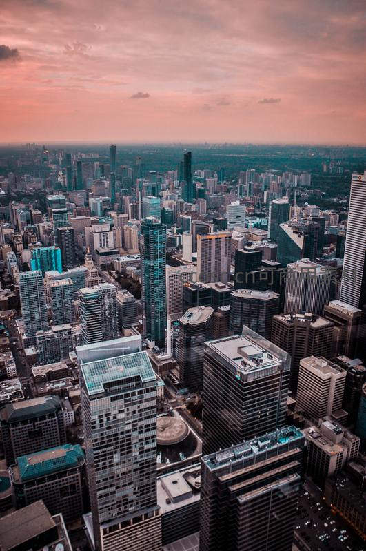 从高空俯瞰繁华都市,密集的摩天大楼在夕阳余晖下熠熠生辉,展现出现代城市的壮丽与活力。