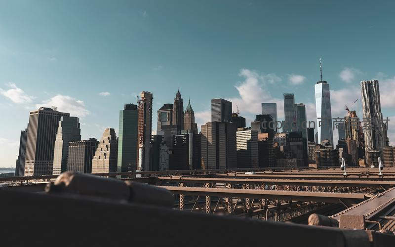 从桥上远眺曼哈顿,世界贸易中心一号大楼高耸入云,周围林立的摩天楼在晴空下构成壮观天际线,尽显都市的繁华与力量。