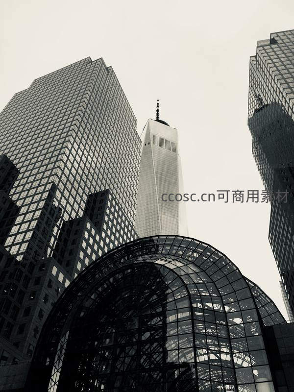 以低角度仰拍纽约世贸中心,其尖顶直指苍穹,前景玻璃穹顶结构精致,黑白影调强化了建筑的几何美感与都市的肃穆感。