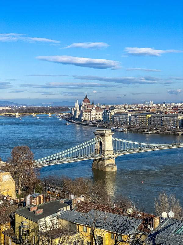 匈牙利首都布达佩斯的经典视角,链子桥优雅跨越多瑙河,背景中宏伟的国会大厦在晴空下熠熠生辉,尽显欧洲风情。