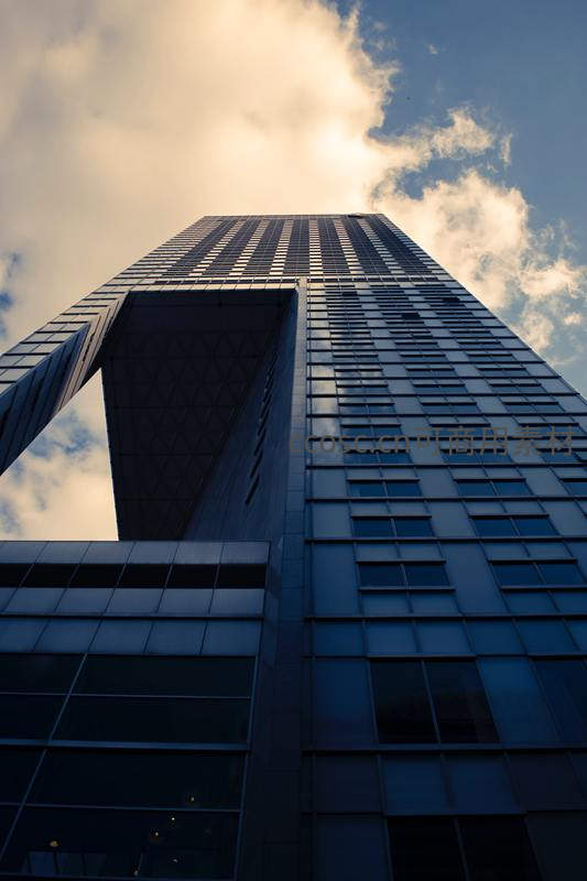 以低角度仰拍视角,捕捉一座宏伟的现代摩天大楼,其冷峻的玻璃幕墙在蓝天白云下更显高耸入云的气势。