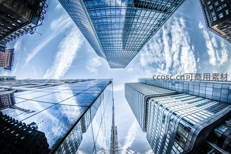 仰视拍摄多栋摩天楼,玻璃外墙映照蓝天白云,形成虚实交错的视觉效果,展现建筑与自然的和谐对话。