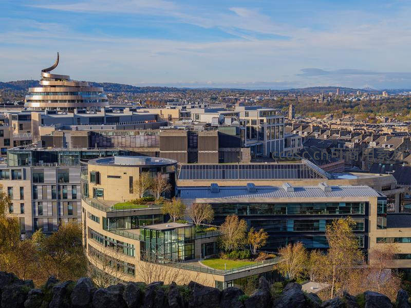从高处俯瞰城市中的现代商务区,建筑错落有致,屋顶绿化与远处山峦呼应,体现生态与都市融合的设计理念。