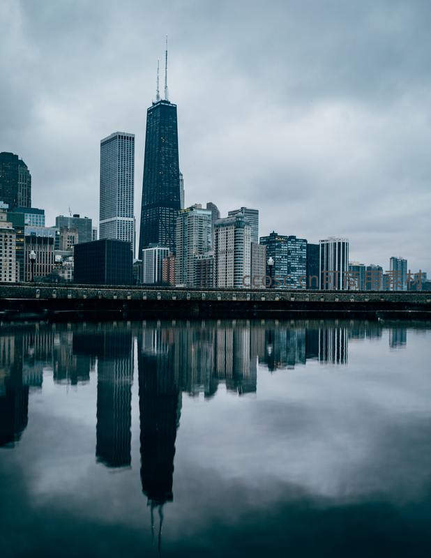 灰暗的天空下,城市的摩天大楼群倒映在平静如镜的水面上,虚实相生,营造出一种静谧、略带忧郁的氛围,极具视觉冲击力。