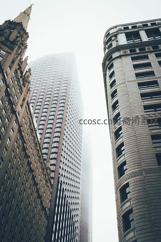 从低角度仰视,三座风格迥异的高楼拔地而起,左侧是哥特式尖塔,中间是现代玻璃幕墙,右侧是弧形复古立面,顶部隐没在浓雾中,展现城市建筑的时空对话。