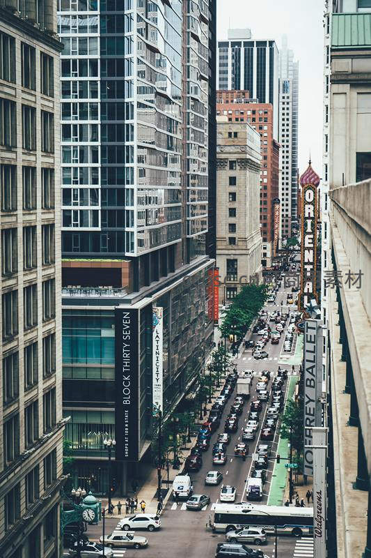 从高处俯瞰一条拥挤的城市主干道,车辆川流不息,行人穿梭于斑马线,两侧是密集的现代与古典建筑,醒目的“ORIENTAL”剧院招牌和“BLOCK THIRTY SEVEN”标识彰显了街区的繁华与历史。