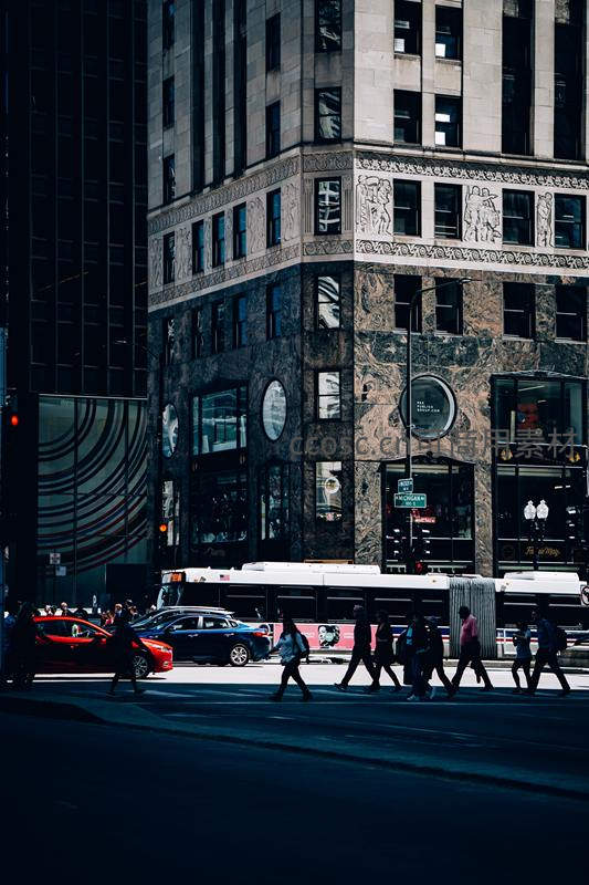 强烈的明暗对比下,一群行人在十字路口快速穿行,背景是一座装饰华丽的古典建筑,一辆红色汽车和白色公交车停在路边,捕捉了都市日常中充满动感与戏剧性的瞬间。