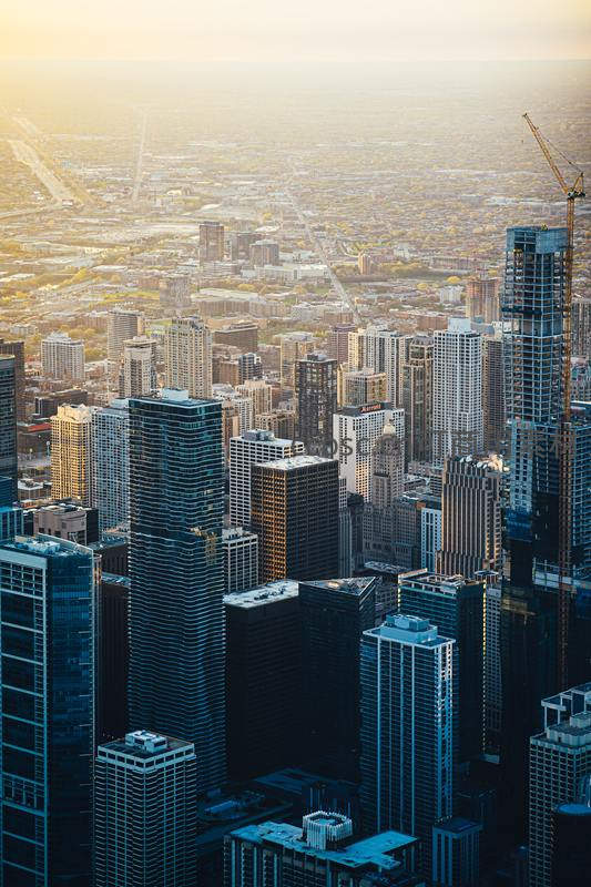 从高空俯瞰,现代化的摩天大楼林立,玻璃幕墙反射着金色晨光,远处城市肌理清晰可见,展现出繁华都市的壮丽与活力。