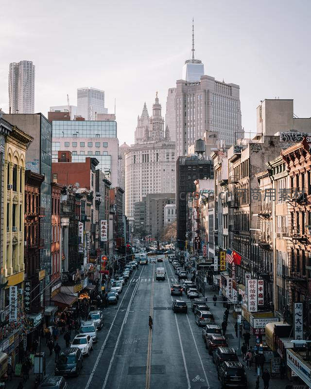 一条充满生活气息的街道向远方延伸,两旁商铺林立、人车熙攘,尽头是标志性的曼哈顿摩天大楼群,彰显了城市的活力与多元文化。