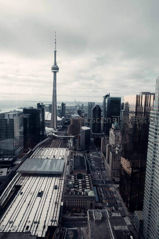阴云笼罩下的多伦多城市全景,标志性的加拿大国家电视塔高耸入云,周围是林立的摩天楼和繁忙的铁路枢纽,尽显都市厚重感。