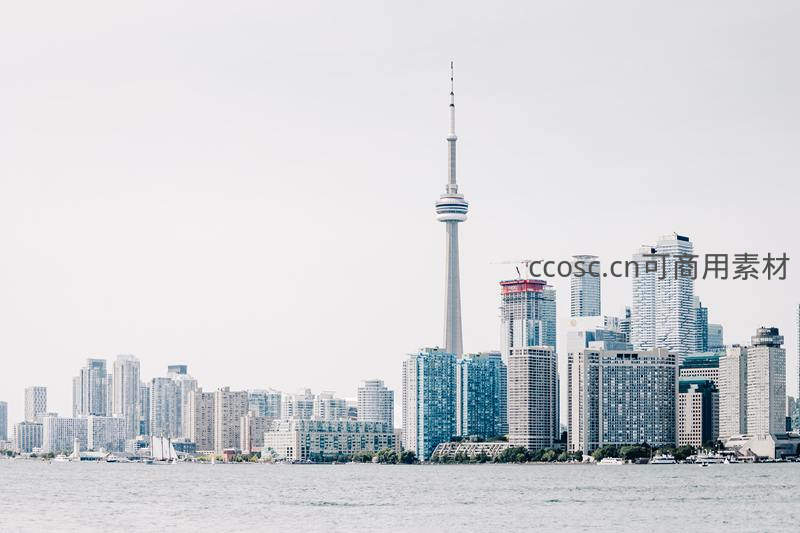 薄雾笼罩下的多伦多天际线,标志性的CN塔清晰可见,周围建筑若隐若现,水面平静如镜,营造出宁静而富有诗意的都市氛围。