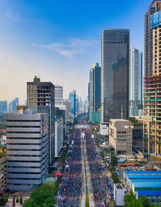 宽阔的城市主干道上,成千上万的跑者汇成彩色洪流,两旁是鳞次栉比的摩天大楼,在晴空万里下共同演绎着都市的动感、健康与无限活力。