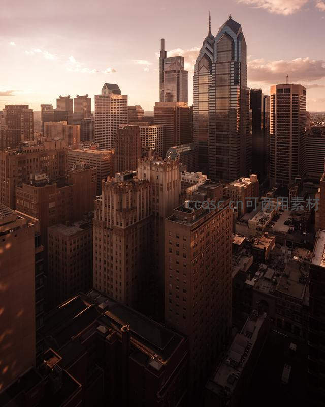 高空俯瞰城市核心区域,温暖夕照洒满楼宇群,建筑高低错落形成丰富层次,光影交织勾勒出城市肌理,充满秩序与历史感。