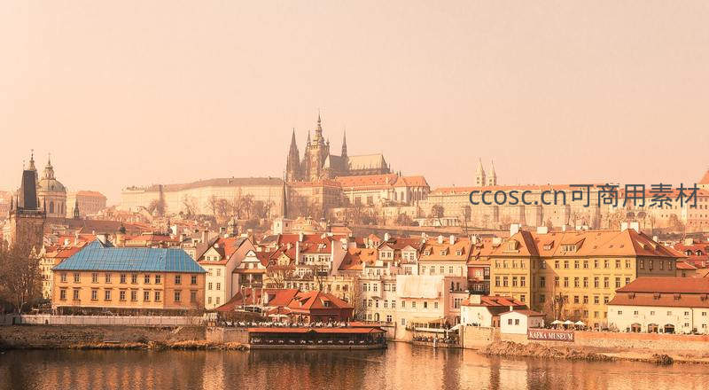 夕阳余晖洒落在河岸两侧的古老建筑群上,远处城堡轮廓清晰,近处红瓦白墙倒映水中,营造出宁静温暖的历史氛围。