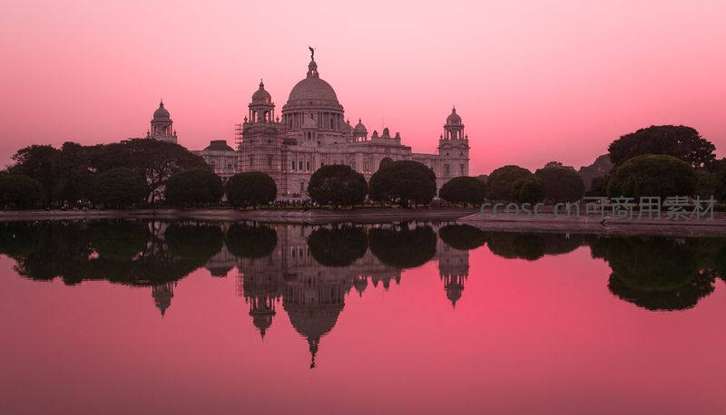 夕阳将天空染成梦幻的粉红色,维多利亚纪念馆的轮廓与水中倒影完美对称,营造出宁静而庄严的氛围。