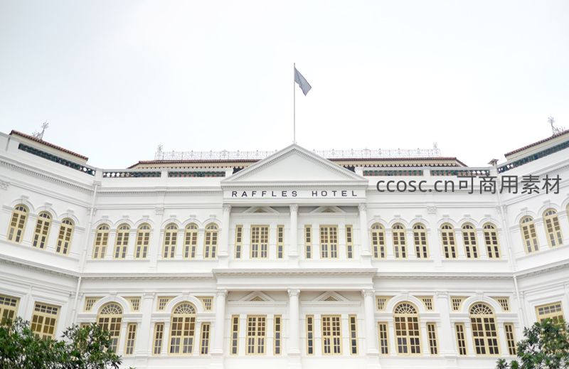 新加坡莱佛士酒店宏伟的白色新古典主义立面,精致拱窗与柱廊展现殖民时代优雅风范,是城市标志性历史建筑之一。