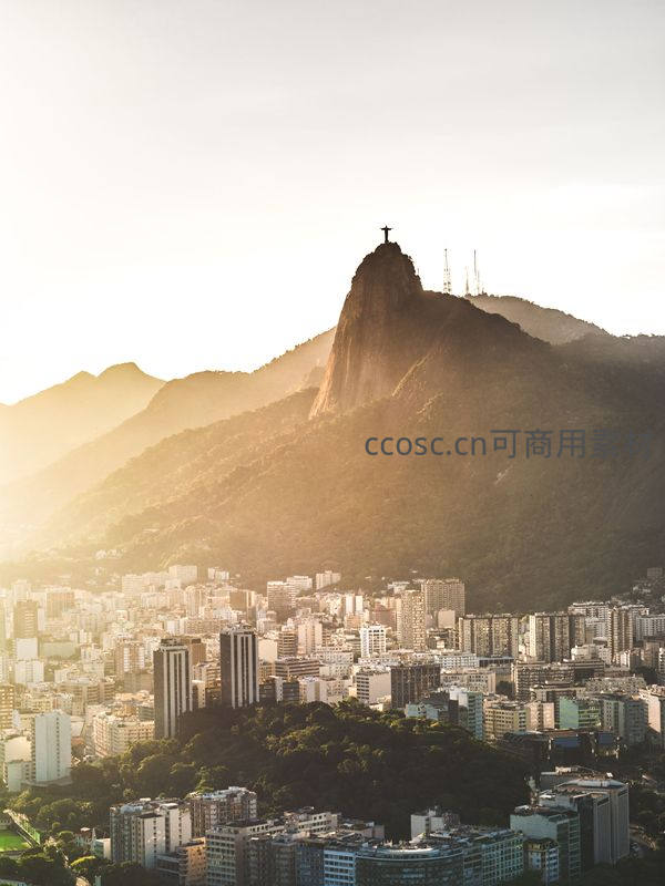 金色晨曦中,里约热内卢的基督救世主像矗立在科帕卡巴纳山顶,俯瞰着脚下密集的城市楼宇与苍翠山峦,气势恢宏。