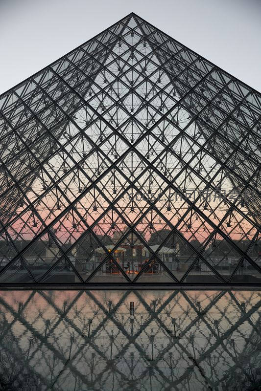 玻璃金字塔倒影映霞光