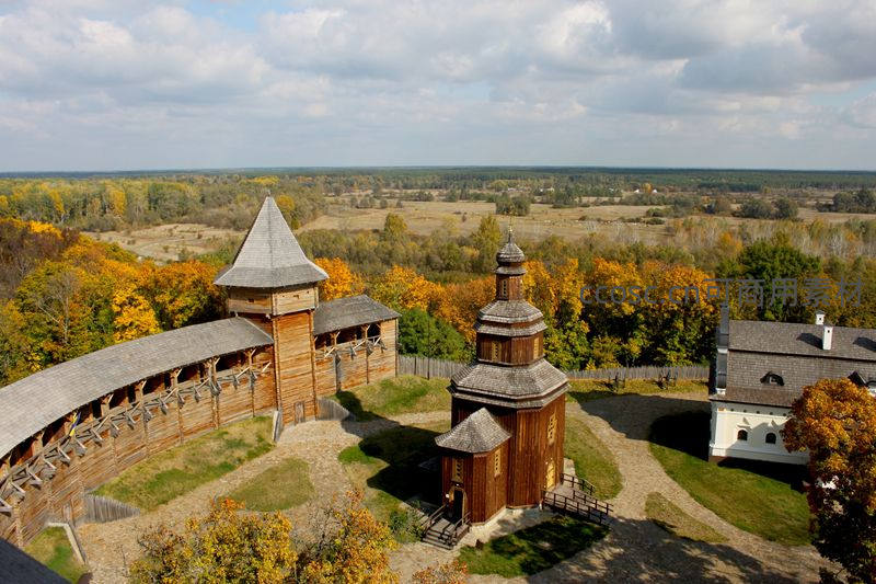 秋日木制古堡俯瞰金黄林海,历史气息浓厚