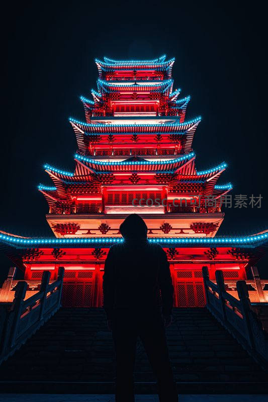一座宏伟的多层古塔在夜晚被红蓝霓虹灯点亮,前景中一个模糊的人影静静伫立,营造出神秘而庄严的氛围。