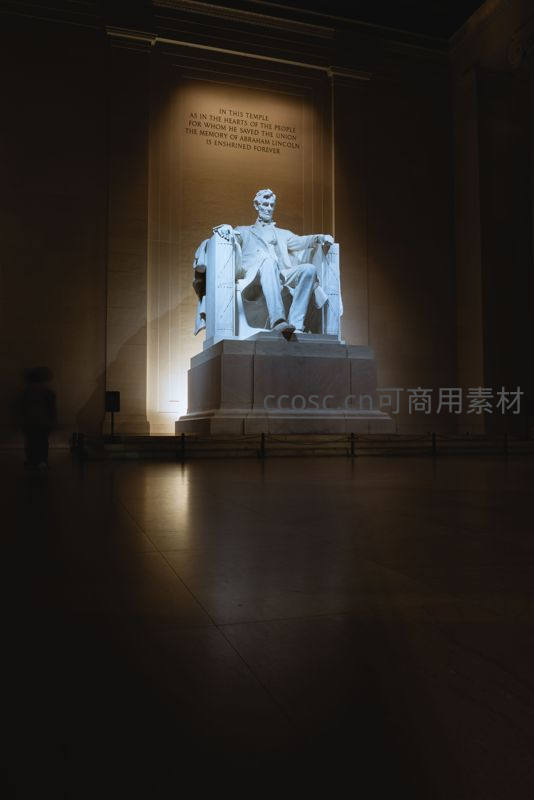 在昏暗而肃穆的纪念堂内,亚伯拉罕·林肯的巨大石像被一束聚光灯照亮,背景墙上镌刻着铭文,充满历史厚重感。
