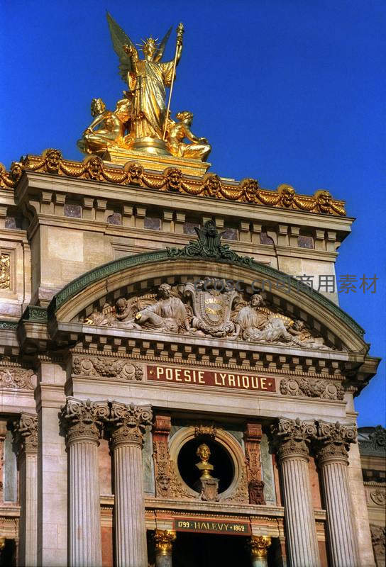 宏伟的巴黎歌剧院正面,顶部装饰着华丽的金色雕像群,在蓝天映衬下尽显奢华与古典艺术之美,是法国建筑的巅峰之作。
