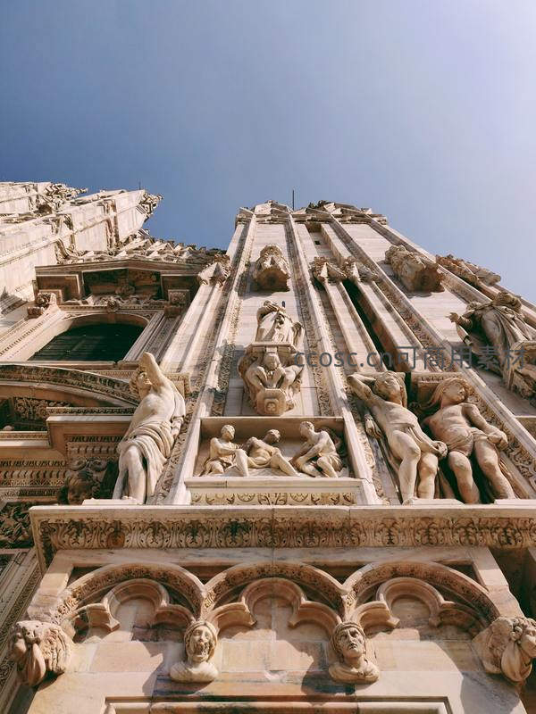 仰视视角下,哥特式教堂外墙布满精美石雕,人物神态栩栩如生,阳光洒落其上,尽显中世纪宗教艺术的庄严与细腻。