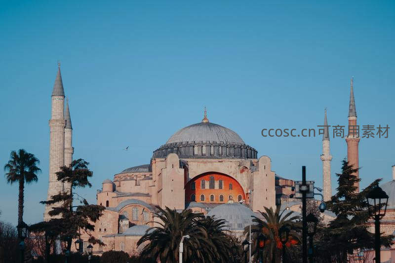 宏伟的圣索菲亚大教堂在晴空下尽显其拜占庭建筑魅力,高耸尖塔与巨大穹顶和谐共存,是东西方文明交融的象征。