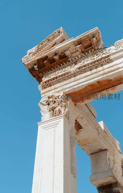 仰拍视角捕捉到古罗马式石柱顶端精美的浮雕装饰,细腻的叶饰与几何纹样在蓝天背景下更显工艺精湛与岁月痕迹。