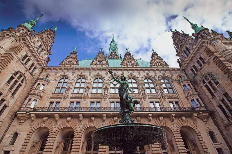仰拍视角下,汉堡市政厅华丽的红砖立面与绿色铜顶在云层间若隐若现,前方喷泉中的青铜雕像栩栩如生,整体建筑气势恢宏,尽显欧洲古典之美。