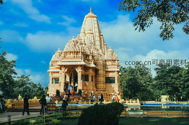 一座金碧辉煌的印度教神庙矗立于绿树环绕之中,其复杂的石雕和层层叠叠的塔楼在晴朗天空下熠熠生辉,吸引着虔诚的信徒与好奇的游客前来朝圣。